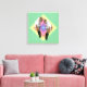 Speglad bild av vit calicokatt med bruna och svarta prickar på svan och huvud, sitter framför en rombform i pastellregu färg. Bakgrund för Mint-grönt.