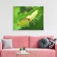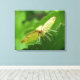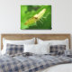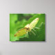 Det här kanvastrycket i fantastisk innehåller ett detaljerat makrofoto av en liten färgad i gulten med bruna markeringar som trycks på en hollyhock löv. I fotografiet kan du se undersidan av vingar, päls på baksidan, dess utbuktande öga och dess bruna och vita ben. Man kan också se att det har upplösts sitt matande rör för att testa om hollyhock löv är mat eller inte.