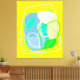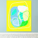 Ett gäng böjt flygplan och linjer i blått, grönaktigt och vitt mellanrum på gulten yta i den här målningen