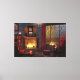 Ett mysigt läshörn på en regnig höstdag. Runt vid himlen med en blazande eld är rödpansarstolar med staplar av bokar och tårar och en tekanna för att fullborda komforten. Utanför en gult döljs den blåsande regnet, som sprinklerar det fönster där en ingerkatt tittar ut.