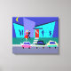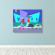 Det här Retro Open House-Kanvastrycket i Party kommer att sätta dig på partysande humör. Tecknadens utformning präglas av utsidan av ett modernt hus i mitten av århundradet. Genom golv för att få tak över glasväggar för turkos kan vi se marinblåsilhuetterna av festive party goers. Ett par chattar framför ett fönster. På motsatt sida av rummet kan vi se en dansman och den mångåriga man som alla försöker undvika. Husets utsida har en glatt röd dörr och en överdimensionerad lila tegel skorsten. En grått-promenad skär en sväv till ytterdörren, genom tårgräset. Natt har ett mörk blått himlar med en gult, ett halvmåne måne. Ett attraktivt par gör "cha-cha-cha" på vägen till sin bil. Den blondande kvinnan bär en klar röd klänning. Hennes stiliga eskort bär en svart kostym och en röd slips. Hans händer är inlindad i kvinnans midjan. På gatan, framför huset, kan vi se tre, ljusa, färgad klassiska bilar. Beställning idag och party som 1959!