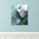 Sjöjungfruns kanvastryck med "Serenity" av Michaeline McDonald. En sjöjungfru prinsessa som bär en stjärnfisk och korall krona beundrar ett par havshästar och clown-fiskar. Vackert tillägg till en nautisk eller havsvik. Välj din storlek.