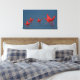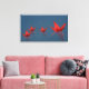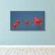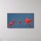 En familj av rödorigami-kranar flyter över en bassäng stilla vatten medan regnen i stänk kring dem.