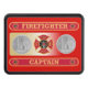 Detta Hitch-skydd för släpvagnen är dekorerat med brandmanskapten Silver Bugle Medallion Shield och ord "brandkatedern".