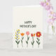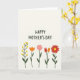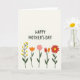 Denna gratulationskort har ett stort, vänligt meddelande placerat över den övre halvan, skrivet med mörk text som sticker ut mot en ljus krämfärgad bakgrund. Det öppna utrymmet runt orden ger designen plats att andas, som en tyst paus innan en varm kram ❤️. Under texten ställer sig fem stiliserade blommor på rad i en mjuk linje, deras prydliga former och mjuka konturer antyder en söt närhet, som vänner som går sida vid sida. Radens början är en förgrenad stjälk prydd med små runda gula blommor, följd av en ensam orange skålformad blomma. Därefter kommer en mjuk rosa blomma med många kronblad, sedan två spetsiga blomknoppar i djuprött och orange som lutar sig mot varandra som om de delar en hemlighet 🌼. Mörkgröna stjälkar och några enk