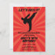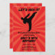 Låt oss sparka! Den här roligtens inbjudan innehåller en röd startbakgrund och en karatsparkande silhuette figur. Perfekt för ditt barns karatfödelsedagsfest.