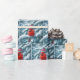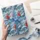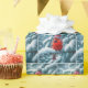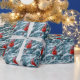 En pulserande röd kardinal med en stickad hatt vid ett snö täckt evergreen gren, omgiven av försiktigt fallande snöflingor