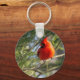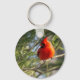 Skämmande kardinala strejkor en attitydform i gräs träd i picturesque, som lägger till ett roligt foto till en robust nyckelring.