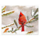 En manlig kardinal invigd på en vinterdag i kallet i snö fullt i gräs träd. Den här bilden togs av Debbie Quick of Debs Kreativ Bilder. Om du vill se fler bilder från Debbie kan du läsa hennes webbplats på: www.debscreativeimages.com