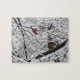En vacker röd kardinalpersika på nyligen tillagad grenar i snö