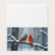 En serensnöskog där en manlig röd kardinal och en inte så skarp kvinnlig kardinalperk på frostigt träd grenar. Sämre snöflingor faller, skapar en lugn och ett magiskt vinterögonblick