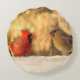 Här är en runda kudde med Mr. och Mrs. Northern Kardinal. Det är hösten med ett gloriskt löv i bakgrunden, men det första snö har fallit till ge inför vintern. Han är en strålande röd färg. Hon är orange, guld och brun. Båda har vapensköldar och orangar. De är sannerligen en kunglighet för hobbyfåglar med deras utpräglade sång och vackra färg.