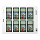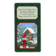 Ett par nordliga rödkardinaler på ett vitt betesstaket som är täckt av snö och som är förlagt med julgranar och en ljusröd båge. De höggs vid en vinterfågelmatare som dekoreras med klockor, ribbon och holly. Realistiskt konstnärligt verk skapat av naturkonstnären Crista S. Forest.