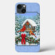 Ett par nordliga rödkardinaler på ett vitt betesstaket som är täckt av snö och som är förlagt med julgranar och en ljusröd båge. De höggs vid en vinterfågelmatare som dekoreras med klockor, ribbon och holly. Realistiskt konstnärligt verk skapat av naturkonstnären Crista S. Forest.
