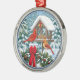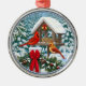 Ett par nordliga rödkardinaler på ett vitt betesstaket som är täckt av snö och som är förlagt med julgranar och en ljusröd båge. De höggs vid en vinterfågelmatare som dekoreras med klockor, ribbon och holly. Artwork skapat av naturartisten Crista S. Forest.