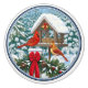 Ett par nordliga rödkardinaler på ett vitt betesstaket som är täckt av snö och som är förlagt med julgranar och en ljusröd båge. De höggs vid en vinterfågelmatare som dekoreras med klockor, ribbon och holly. Realistiskt konstnärligt verk skapat av naturkonstnären Crista S. Forest.