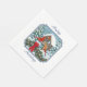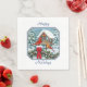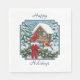 Ett par nordliga rödkardinaler på ett vitt betesstaket som är täckt av snö och som är förlagt med julgranar och en ljusröd båge. De höggs vid en vinterfågelmatare som dekoreras med klockor, ribbon och holly. Realistiskt konstnärligt verk skapat av naturkonstnären Crista S. Forest.