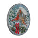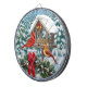 Ett par nordliga rödkardinaler på ett vitt betesstaket som är täckt av snö och som är förlagt med julgranar och en ljusröd båge. De höggs vid en vinterfågelmatare som dekoreras med klockor, ribbon och holly. Realistiskt konstnärligt verk skapat av naturkonstnären Crista S. Forest.