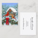Ett par nordliga rödkardinaler på ett vitt betesstaket som är täckt av snö och som är förlagt med julgranar och en ljusröd båge. De höggs vid en vinterfågelmatare som dekoreras med klockor, ribbon och holly. Realistiskt konstnärligt verk skapat av naturkonstnären Crista S. Forest.