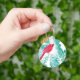 Denna bild är designad med en röd kardinal sitta på ett gren i gräs träd som är täckt av snö. Kardinalen är sitta och tittar på när snö flingor faller från himlar. Marken är täckt med snö. Denna nyckelkedja kommer att bli ett underbart biet att äga eller till ge som en gåva.