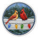 Norra Röda kardinalerna hissar på ett vitt staket som sträckte sig med ljus vid jul. Snöflingor faller från himlar nattetid och täcker den omgivande skogen med en vintertäcke av vitt.