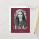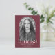 Modern examens tacksamhets-kort med examenfotot inframat av en kardinalröd bågformad ram. "Tack" visas i vit modern kursiv text. Anpassa framsidan av det trendiga examens tacksamhets-kortet genom att lägga till examenets namn, skolans namn och examensår. Baksidan av kortet visar din returadress och anpassat meddelande.