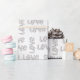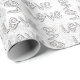 KÄRLEK bubbeltypstext med mandelbaserade blommar på en vit satin, fuktad bakgrund.