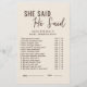 Firar bruden som ska vara med vår charmerande Möhippa sa att hon sa att spel! Gästerna kommer att få gissningar om vem som sa eller gjorde vad med denna roligt och insiktsfulla frågor om lycklig-paret. Det här spelet är ett bra komplement till din möhippa-festligheter. Det är ett vackert spel för vilda blommor. Det är ett trevligt sätt att lära sig mer om bruden och trippen samtidigt som man skapar minnesvärda stunder. Låt roligten börja och se vem som vet paret bäst!
