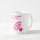 Det här vita mugg har texten "Kärlek är den ultimata WiFi-anslutningen: det känner inga gränser" i ett rosa-teckensnitt. Under texten finns det en bild av en WiFi-signalikon med en hjärtform vid högerna grund på signalen linjer. Utformningen användor på ett smart sätt en modern metafor som beskriver kärlek och jämför den med en WiFi-anslutning som överskrider gränser. Det är en perfekt gåva till alla som kärlek och romantik.