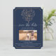 Spara datum-kort med foto i marinblått med typografi i rose gold glitter-hjärta. Elegant, mörk marinblå bakgrund med kalligrafi-skrift hantletterad typografi-illustration av Audrey Jeanne. Bokstäverna har sedan förvandlats till rose gold glitter med ett tredimensionellt utseende och omges av rosa virvlande rankor i form av ett hjärta. Baksidan är en andra, fullstor 5 x 7 rambar bild som blir en minnesskänk till familj och vänner. All konst skapades av internationellt licensierade konstnären och designern Audrey Jeanne Roberts, upphovsrättsskyddad.