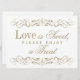 Dekorativa snurrar och blomstrar ram den här elegantens vintage inspirerade till "Kärlek är Sweet, njut av ett Treat"-desserttecken från bord. Vitt och antika guld utformat färg.