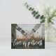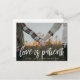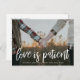 När livet ändrar dina planer eller ställer in ditt bröllopsdatum på grund av händelser i världen, är denna moderna ändra datum-fotokortdesign en perfekt bröllopsförseningskort eller för att ändra ditt bröllopsdatum med ett stort förlovningsfoto av dig och din fästman och vit text. Detta ändra datum-kort säger "Kärlek är tålamod".