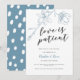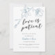 Elegant och modern bröllopsannonsering för försenat bröllop med en handritad illustration av magnoliablommor i dammig blå färg och en skrivstilstext nedanför som säger "kärlek är tålamod"