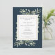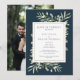 Med delikat akvarellgrönska på en mörk havsblå bakgrund kan detta eleganta botaniska bröllopskort anpassas med ert speciella foto och bröllopsdetaljer. Designad av Thisisnotme©
