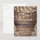 Kärlek är tålamod! Låt dina gäster veta om de nya bröllopsplanerna med dessa landsbygdstematiska vykort. Denna design har trä, sladdbelysning och falsk spets. Anpassa med dina detaljer i chic script typografi.