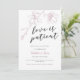 Elegant och modern bröllopsuppskjutande anmälningskort med en handritad illustration av magnoliablommor i dammig rosa färg med en scripttext nedan som säger "kärlek är tålmodig."
