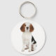 Nu...Vem kan stå emot ansikte i en Beagle-marionett hund? Den här roligt hund-nyckelringen har en brun, svart och vit Beagle-valp sitta på en skarp vit bakgrund.