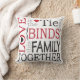 Svart och rött kuddfodral visar orden "Kärlek är det band som binder den här familjen samman" på framsidan. Baksidan visar det familjenamn du väljer. Bra accent för familjerummet.
