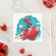En kvinna med flytande rött hår rider en ljusröd, hjärtformad raket omgiven av fluffa moln i en klar blå himmel. Texten lyder: Var försiktig med bombningen i kärlek!