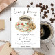 Vattenfärgad elegant blommar vintage kaffe kopp med sked och kaka. Kärlek brinner i möhippa. Kaffemated möhippa. Vintage kaffe kopp med blommor.
