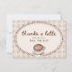 Fira bruden med detta Love is Brewing Gingham Coffee Bridal Shower Tacksamhetskort. Med en akvarell latte krönt med hjärtformad skumkonst, kaffebönor, "Tack så mycket" i trendig kalligrafi samt en vintage-ram med vågig kant över en varm beige gingham-bakgrund, ger denna mysiga caféinspirerade design lantlig charm till din bröllopsfest. Perfekt för att uttrycka tacksamhet gentemot gästerna, passar detta redigerbara tacksamhetskort perfekt ihop med matchande ”Love is Brewing”-inbjudningar och festdekorationer.