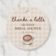 Tillsätt en varm och charmig touch till din fest med dessa Love is Brewing Gingham Coffee Bridal Shower gåv-märkning. Med en akvarell latte med hjärtformad skumkonst, kaffebönor, "Thanks a Latte" i trendig kalligrafi samt en mjuk beige gingham-bakgrund, är denna mysiga caféinspirerade design perfekt för en rustik eller höstinspirerad bröllopsfest. Dessa redigerbara märken passar vackert ihop med matchande ”Love is Brewing” inbjudningar, dekorationer och brevpapper från kollektionen.