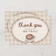 Fira bruden med detta Love is Brewing Gingham Coffee Bridal Shower Tacksamhetskort. Med en akvarell latte krönt med hjärtformad skumkonst, kaffebönor och en vintage snidad ram över en varm beige rutyta ger denna mysiga caféinspirerade design rustik charm till din bröllopsfest-stationär. Perfekt för att uttrycka tacksamhet till gästerna, detta redigerbara tackkort passar vackert ihop med matchande "Love is Brewing" inbjudningar och festdekorationer.