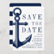Ett unikt sätt att spara datumkorten som är skräddarsydda för ditt framtida bröllop med ett unikt nautiska stil. Inbjudningskortets framsida har ett fet ankare för vintage som kompletterar ett nautiskt stil. På motsatt sida är mörk marin och vit rand för att slutföra utseendet. Alla inslag är olåsta, så ha roligt att skapa och skapar dem själva.