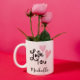 Färgat Mugg har två söta vattenfärger Hearter i rosa och ro, med en underbar svart typografi "Kärlek You" och ett namn som du kan ändra eller ta bort från personlig-menyn. Perfekt för Alla hjärtans dag eller något annat tillfälle att fokusera på bran och sprida glädje.