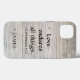 Kärlek omfattar hela Sak, med namn eller monogram redo att uppdatera. Ett tidlöst citat från bibeln om kärlek uthållighet paras med en tryckt trädesign som bygger på ett foto av ett riktigt träträ bord. Bord i bilden varade under flera år av väder och använda, och har sprickor och svimmat grått färg till följd av detta. En passande metafor för kärlek varaktiga natur. Citat från första Corinthians. Träets utformning ser ut som coola och täcker runt fodral i den här layouten.