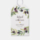 Denna taggdesign för olivolja som bröllagsfavoriter har upp- och nedåtvända akvarell olivgrenar med gröna blad och svarta oliver. Meddelandet "Infused with Love" och namnen är skrivna i en handskriven stil; resten är skrivet i versaler. Ovanför namnen finns ett litet guldhjärta. Bakgrunden är vit.