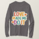 Lägg till lite roligt och romantik i stil med den här kraftfulla designen "Kärlek gjorde mig till det"! Med fet, färglöst brev och lekande hjärtan är den här teckningen perfekt för klistermärken, mugg, T-shirts, tote bags med mera. Ett trendig för par, Alla hjärtans dag, eller någon som tro i kärlek.