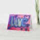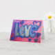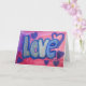 Målning av "Kärlek" i ord i bomullskandblått mot bakgrund av färgad av rosa och lila bubbelgum. Lila och blåhjärtan dansar runt brev. Det finns ett ljus lagrar av blått och silver glitter över toppen. Anpassa det här hälsningskortet för ord-bilder i kärlek med egen text och bilder med hjälp av knappen "Anpassa det".