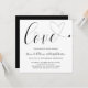 Typografi Bröllopsinbjudan med ord, "kärlek" i svart kalligrafi med en hjärtsvikt i slutet, över en vit bakgrund tillsammans med namn i ett handskript. Den enkla och minimala layouten och mängden öppet utrymme ge är en modern känsla och kalligrafitexten och hjärtat ge är en romantisk vändning.